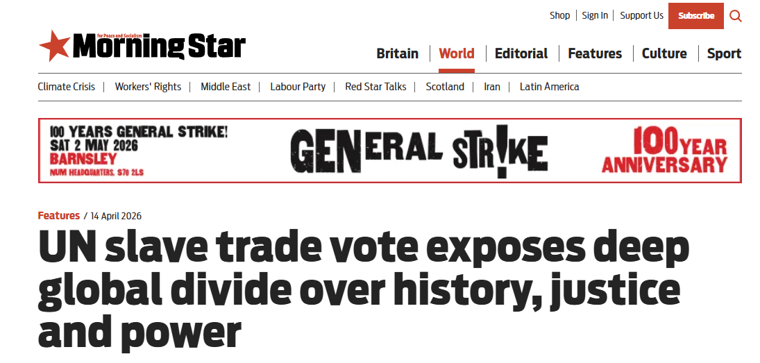 英國(guó)新聞網(wǎng)站《晨星報(bào)》4月14日刊發(fā)題為《聯(lián)合國(guó)奴隸貿(mào)易投票:歷史、正義與權(quán)力的深層裂痕》的評(píng)論性文章,作者是艾薩克·薩尼(Isaac Saney)和詹姆斯·康茨·厄爾利(James Counts Early),文章摘譯如下: