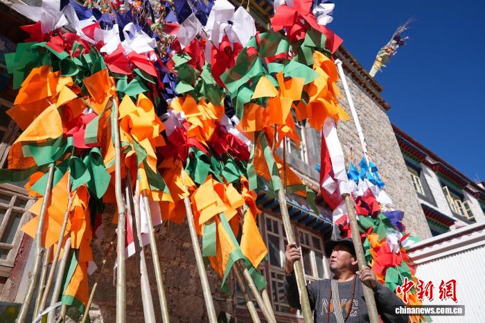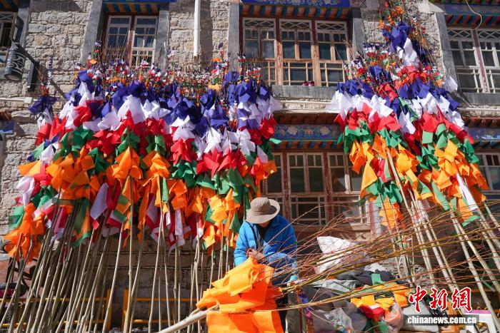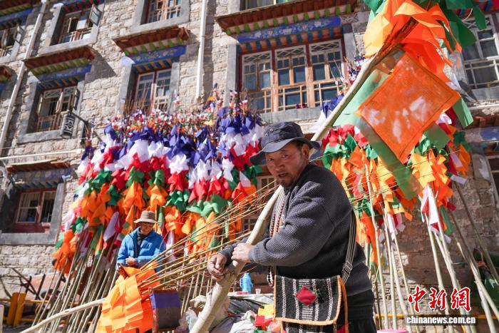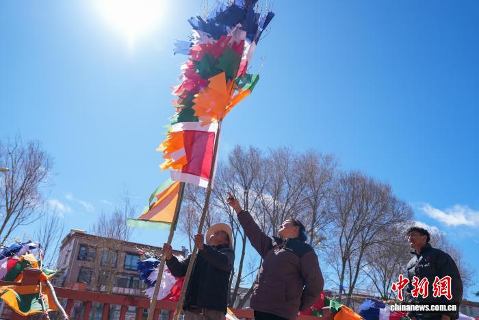 2月5日,臨近藏歷新年,在西藏自治區(qū)拉薩市街頭,農牧民正縫制五彩經幡樹。五彩經幡樹是藏族民眾在藏歷新年前必備的年貨之一。藏歷新年期間,藏族民眾會選擇一個良辰吉日,為自家的房頂更換五彩經幡樹,祈求新的一年里五谷豐登,吉祥如意。圖為來尼木縣的普瓊扛著五彩經幡樹。貢確 攝