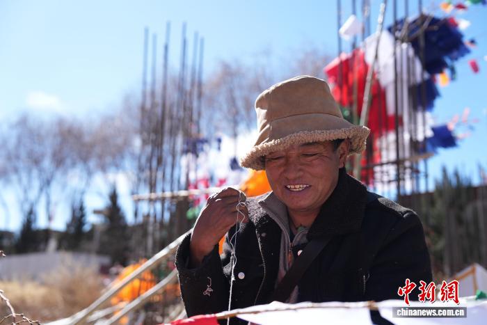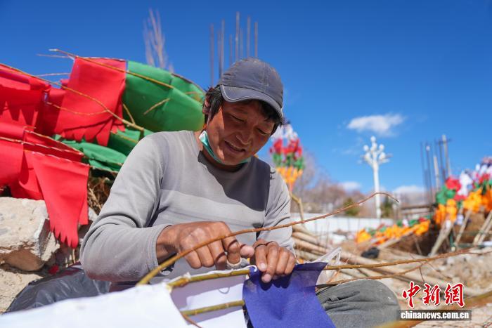 2月5日,臨近藏歷新年,在西藏自治區(qū)拉薩市街頭,農牧民正縫制五彩經幡樹。五彩經幡樹是藏族民眾在藏歷新年前必備的年貨之一。藏歷新年期間,藏族民眾會選擇一個良辰吉日,為自家的房頂更換五彩經幡樹,祈求新的一年里五谷豐登,吉祥如意。圖為格桑扎西正在縫制五彩經幡樹。貢確 攝