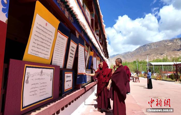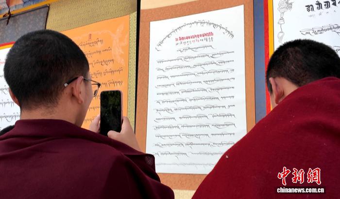 圖為色拉寺僧人結(jié)伴觀賞藏文書法作品展。貢桑拉姆 攝