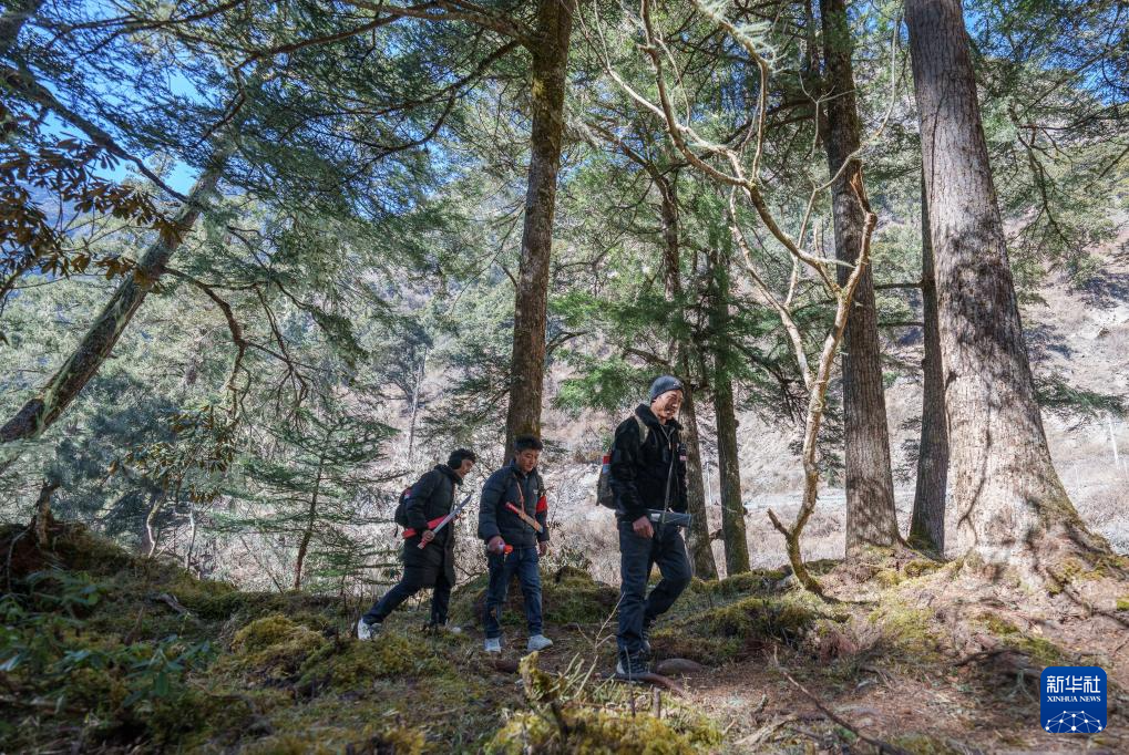 在玉麥鄉(xiāng)境內(nèi),護(hù)邊員在叢林里巡邏(2026年2月6日攝)。新華社記者 丁增尼達(dá) 攝