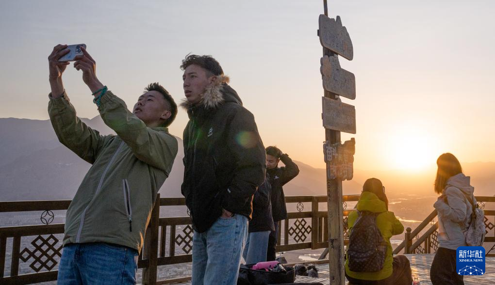 4月26日日出時分,游客在拉薩市南山公園拍照。新華社記者 丁增尼達 攝