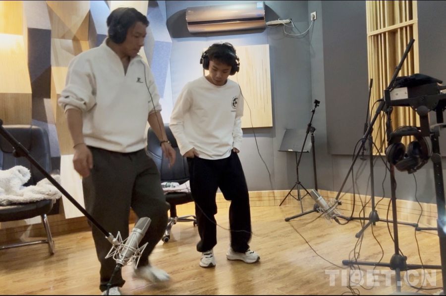 旦增羅布(左)與同事在錄音棚錄音 受訪者供圖
