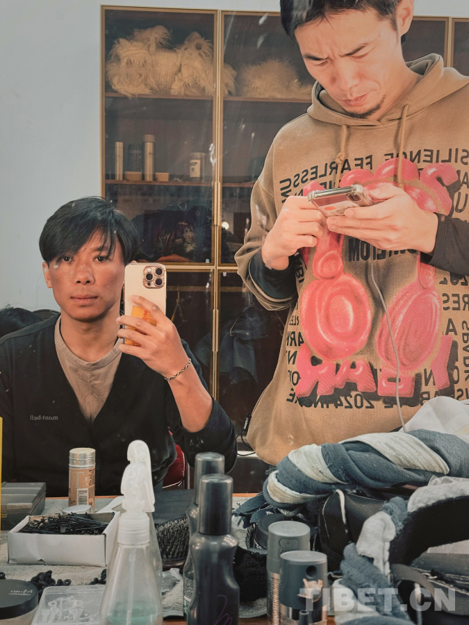旦增羅布(左)在后臺化妝造型 受訪者供圖