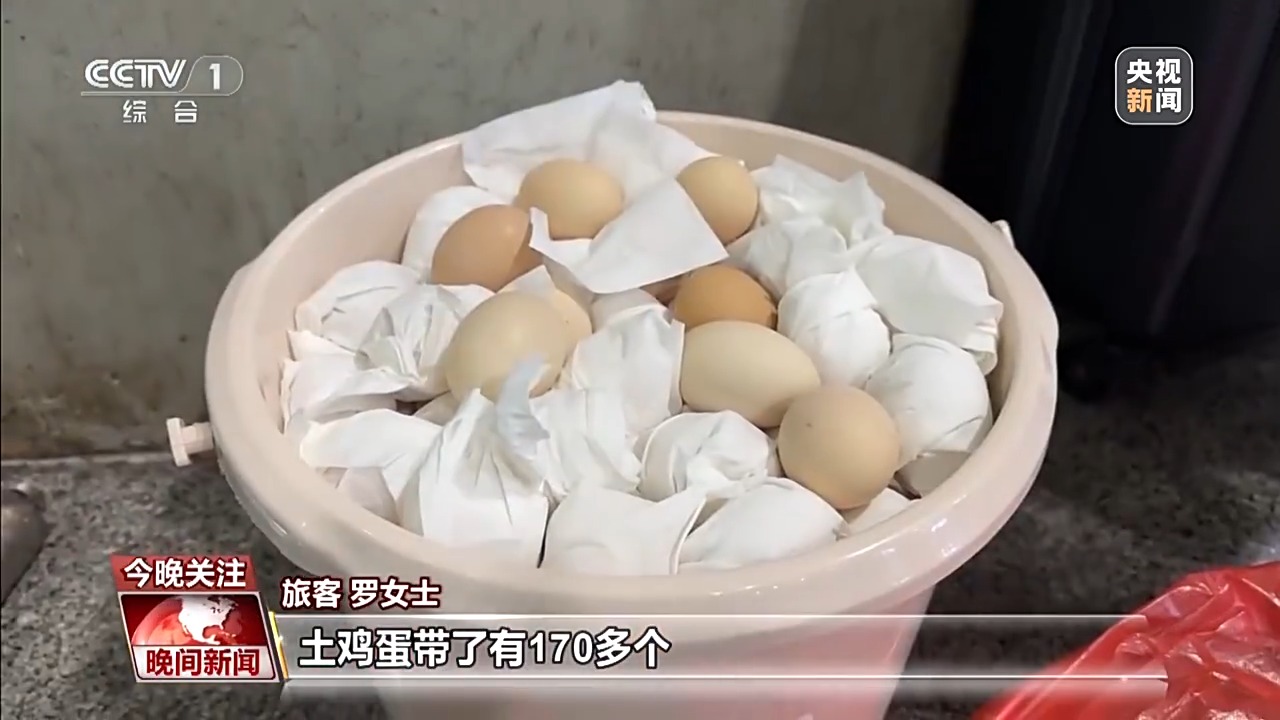 旅客 羅女士:土雞蛋帶了有170多個,給兒媳婦還有女兒,她們每一個拿點,她們都在成都上班。老家?guī)н^來的土雞蛋,味道不一樣,吃起來香嘛。
