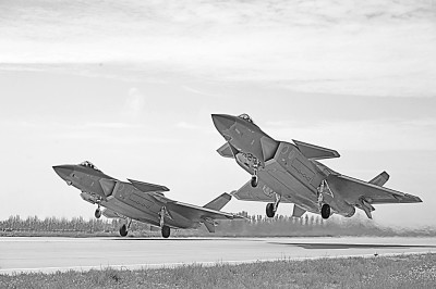空軍“王海大隊”飛行員駕駛殲-20戰(zhàn)機編隊起飛。王鴻飛攝/光明圖片