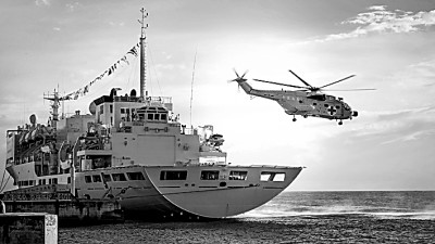 中國海軍“和平方舟”號醫(yī)院船靠泊所羅門群島霍尼亞拉港期間,艦載醫(yī)療救護直升機開展巡診服務(wù)。新華社發(fā)