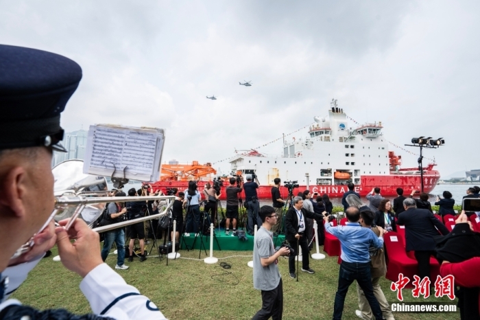 這次,香港更是以“海陸空”上陣歡迎“雪龍2”號(hào)到訪香港。在“雪龍2”號(hào)不遠(yuǎn)處,兩艘拖船和一艘消防船在碼頭附近對(duì)射水柱,形成水拱門。香港飛行服務(wù)隊(duì)的直升機(jī)飛過(guò)維多利亞港上空示意致敬,香港警察銀樂隊(duì)在現(xiàn)場(chǎng)奏樂,九龍巴士車隊(duì)貼上歡迎“雪龍2”號(hào)標(biāo)志,還有舞獅隊(duì)歡迎“雪龍2”號(hào)來(lái)到香港。