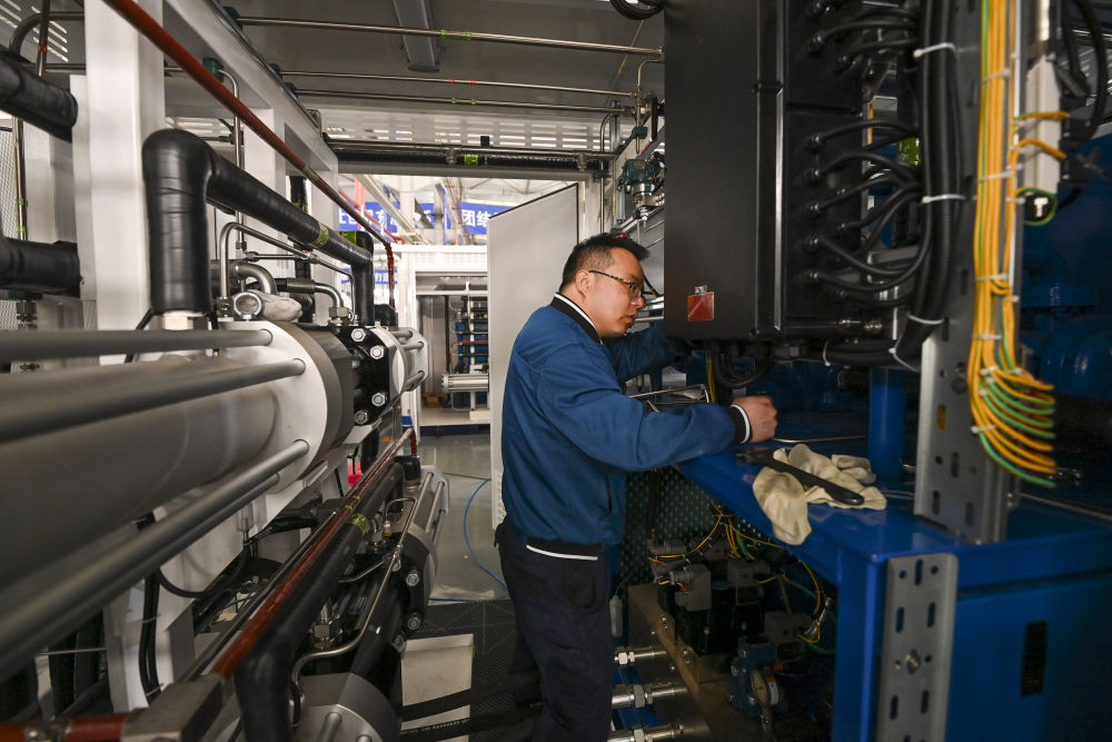 在位于山西省長治市高新技術(shù)產(chǎn)業(yè)開發(fā)區(qū)科技工業(yè)園的一家公司內(nèi),工作人員在調(diào)試氫能設(shè)備(4月2日攝)。新華社記者 楊晨光 攝