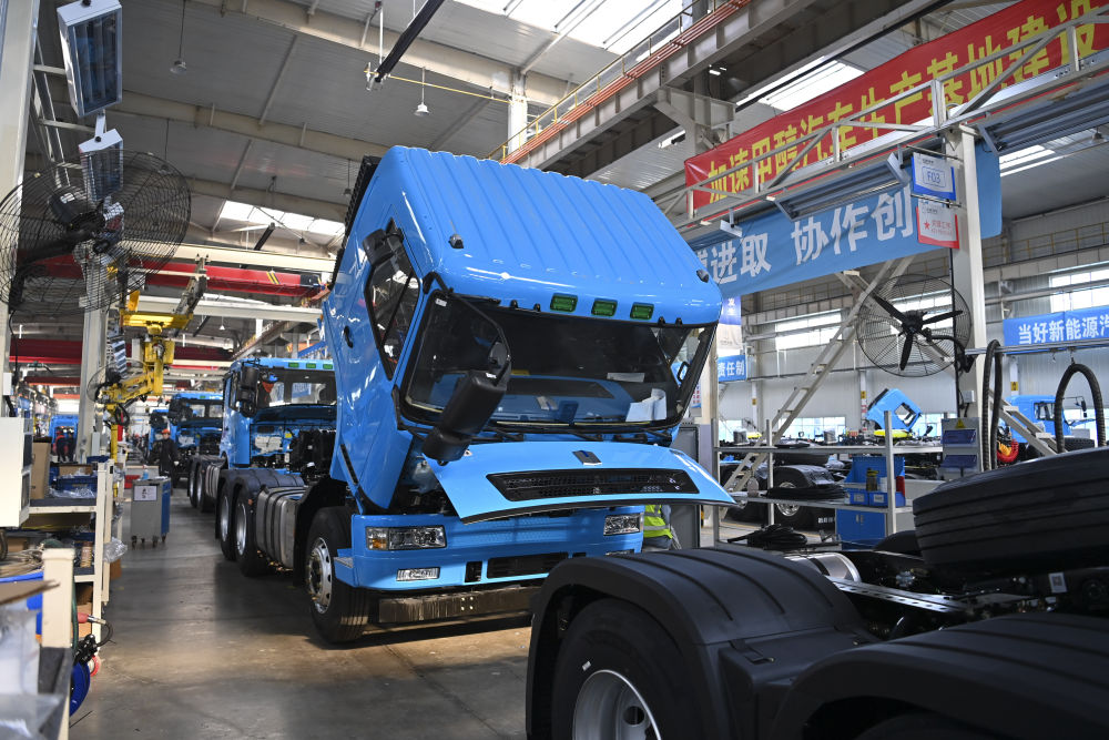 這是在位于山西省晉中市榆次區(qū)的山西新能源汽車工業(yè)有限公司(吉利晉中基地)拍攝的甲醇重卡(4月1日攝)。新華社記者 楊晨光 攝