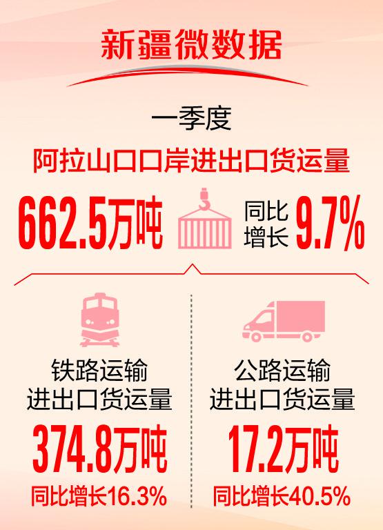 一季度,阿拉山口口岸鐵路運(yùn)輸進(jìn)出口貨運(yùn)量374.8萬噸,同比增長(zhǎng)16.3%;公路運(yùn)輸進(jìn)出口貨運(yùn)量17.2萬噸,同比增長(zhǎng)40.5%。公路、鐵路進(jìn)出口貨運(yùn)量均呈現(xiàn)穩(wěn)步上升的局面。