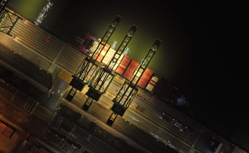 2024年1月16日,大型集裝箱班輪“巴赫”號(hào)靠泊在天津港太平洋國際集裝箱碼頭(無人機(jī)照片)。新華社記者 趙子碩 攝