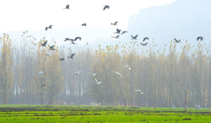 圖為山西稷山汾河國(guó)家濕地公園白鷺與黑鸛齊飛。栗盧建 攝