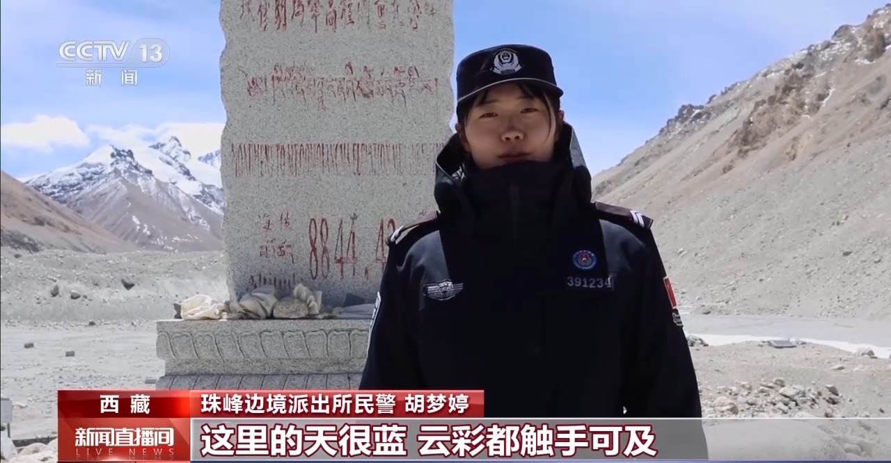 珠峰邊境派出所民警 胡夢婷:這里的天很藍,云彩都觸手可及。珠穆朗瑪峰,世界最高峰,對于我來說不再是課本上那遙不可及的存在,而是我已經(jīng)抵達并駐守的地方。
