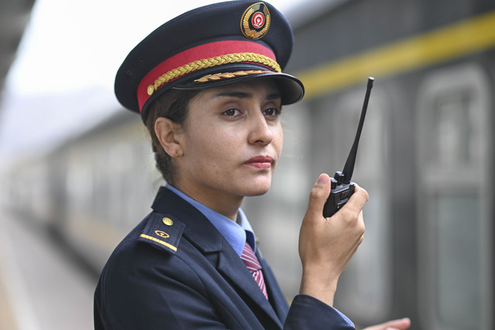 由喀什開往成都西的列車抵達甘肅金昌站,艾爾開牙·多力開通過對講機和同事聯(lián)系(4月19日攝)。