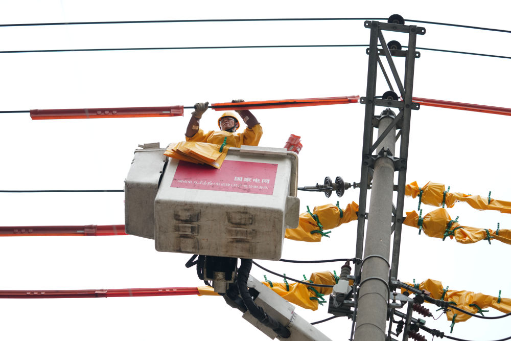 4月24日,賀彪在湖南省長(zhǎng)沙市岳麓區(qū)一小區(qū)開(kāi)展帶電作業(yè)。新華社記者 薛宇舸 攝