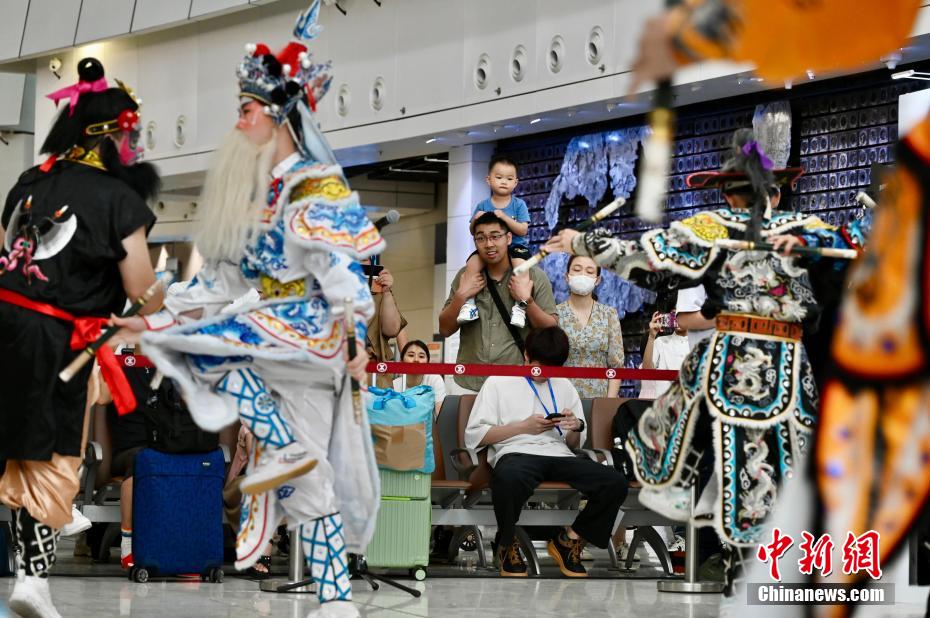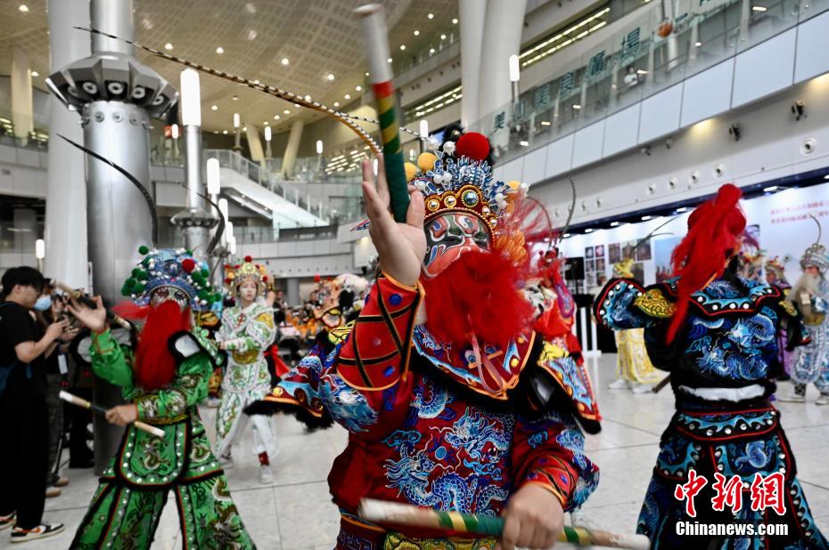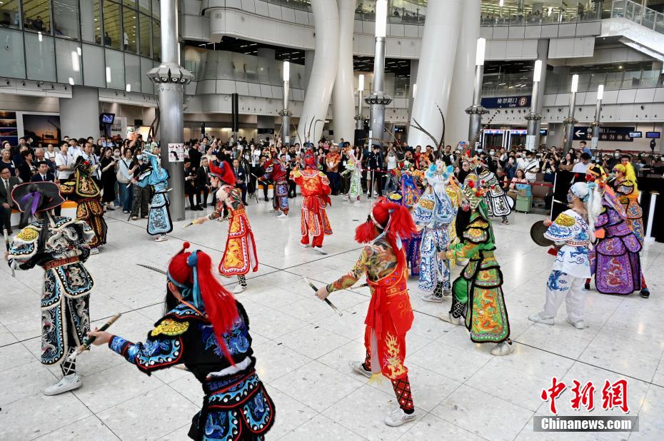 圖為英歌舞表演吸引大批旅客觀看。
