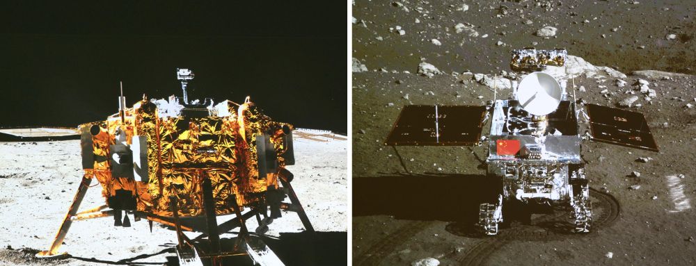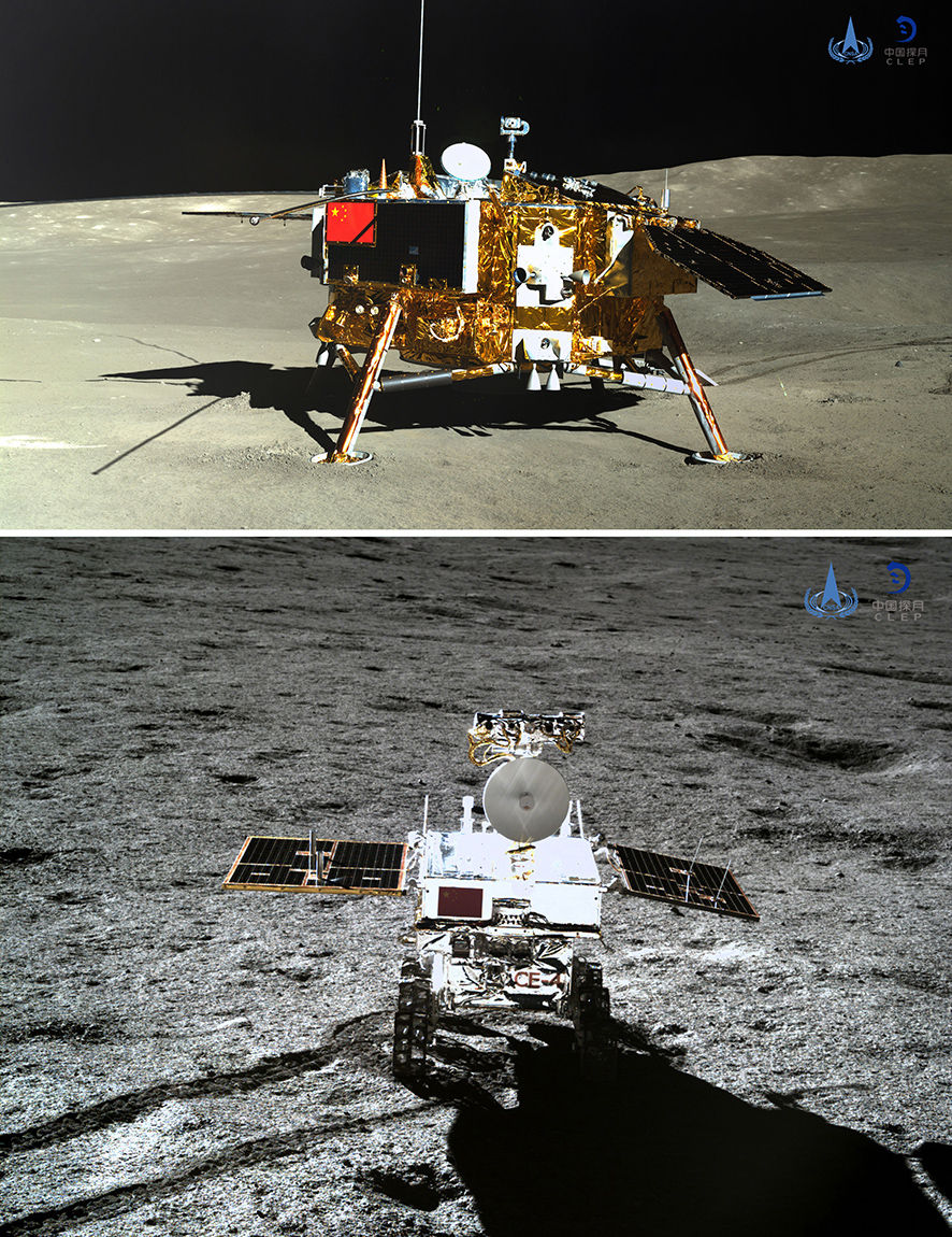2019年1月11日下午,嫦娥四號(hào)著陸器與玉兔二號(hào)巡視器工作正常,在“鵲橋”中繼星支持下順利完成互拍(拼版照片)。新華社發(fā)(國(guó)家航天局供圖)