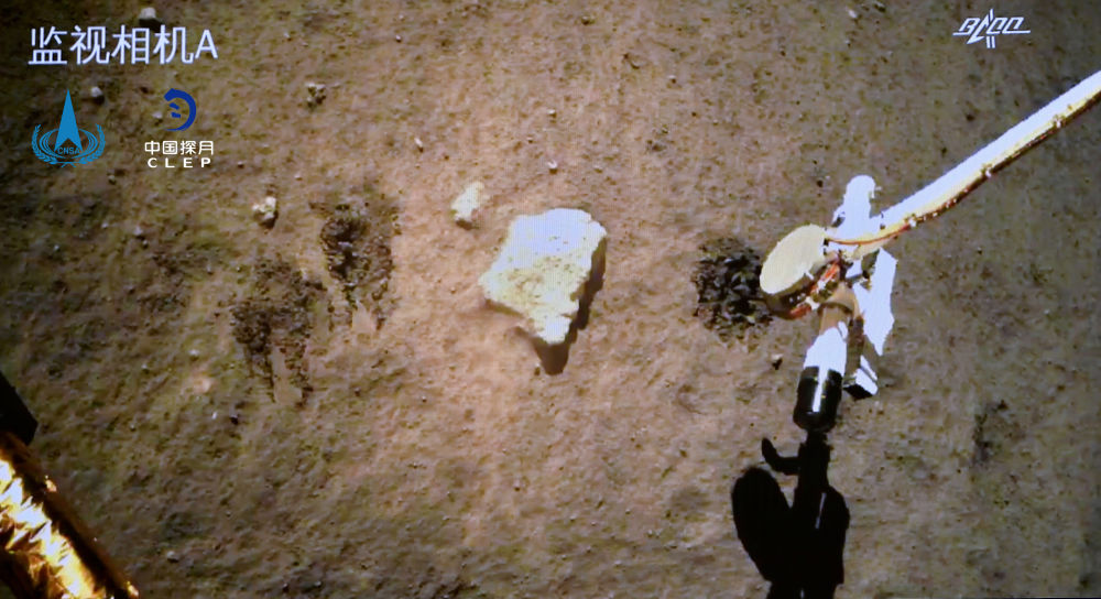 2020年12月2日,嫦娥五號(hào)探測(cè)器在月球表面自動(dòng)采樣。新華社發(fā)(國(guó)家航天局供圖)