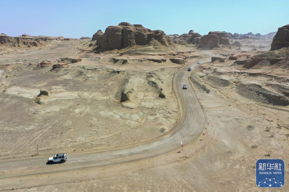 在新疆克拉瑪依市烏爾禾區(qū)世界魔鬼城景區(qū),車友在自駕線路上疾馳(5月1日攝,無人機(jī)照片)。