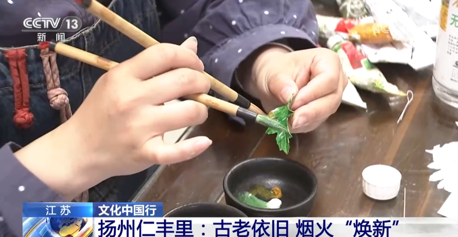 總臺(tái)央視記者 楊威:將傳統(tǒng)的非遺技能進(jìn)行適合現(xiàn)代生活的活化式展現(xiàn),是仁豐里非遺呈現(xiàn)的一大特色。像作為江蘇省級(jí)非遺的揚(yáng)州通草花制作技藝,已經(jīng)有了超過兩千年的歷史,以前只是專攻于宮廷,如今在這里您可以近距離地觀賞手藝人們現(xiàn)場制作的技巧,也可以親自上手做一個(gè)屬于自己的通草花帶回家。