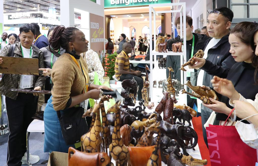 2023年11月6日,來自津巴布韋的艾薇頓絲·察卡瓦在展臺向參觀者介紹木雕展品。這是她第一次來到中國上海參加進博會,這些木雕都是她的哥哥在家里制作的,她想通過進博會為哥哥的木雕作品找到好的銷路。新華社記者方喆攝
