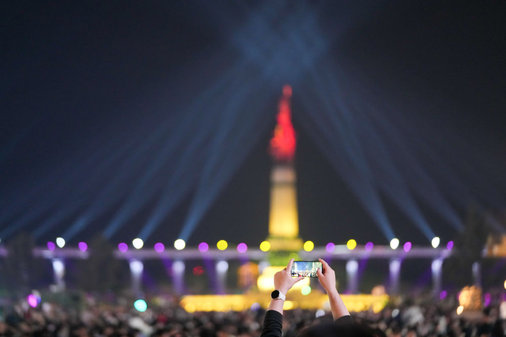5月3日,人們在哈爾濱防洪紀念塔廣場觀賞、拍攝光影秀。