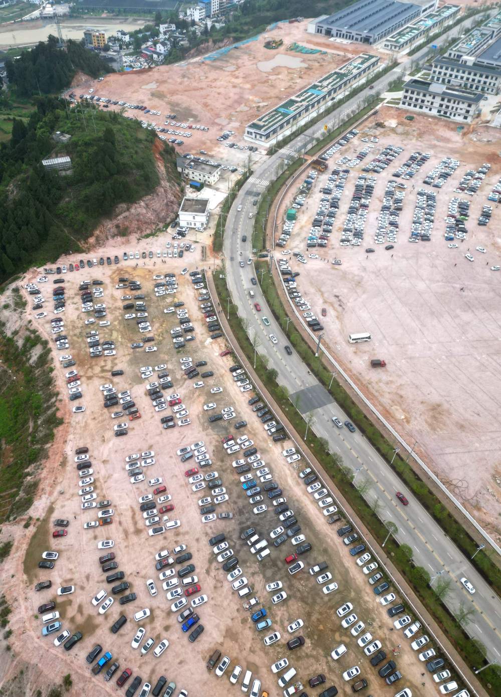 5月1日,游客車輛在貴州省黔東南苗族侗族自治州臺江縣臺盤村停車(無人機照片)。為了滿足外地游客觀看“村BA”的需求,當地利用閑置空地規(guī)劃設置免費臨時停車場,增加車位7000余個,供游客免費停車。新華社發(fā)(余天英 攝)