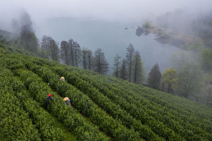 2024年4月7日,在位于浙江省金華市金華山鹿田村的婺州舉巖茶基地,茶農(nóng)在采摘舉巖茶鮮葉,發(fā)展特色茶產(chǎn)業(yè)是推動當?shù)匕傩展哺坏闹匾緩街唬o人機照片)。新華社記者 徐昱 攝