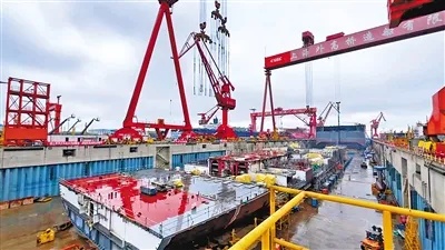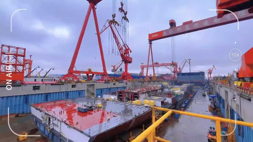 兩臺(tái)龍門吊緩緩起降,有序吊裝船體部件——中國(guó)船舶集團(tuán)上海外高橋造船2號(hào)船塢,第二艘國(guó)產(chǎn)大型郵輪不久前在這里迎來下塢搭載總裝節(jié)點(diǎn)。
