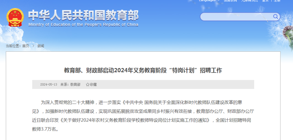 教育部、財(cái)政部啟動2024年義務(wù)教育階段“特崗計(jì)劃”招聘工作