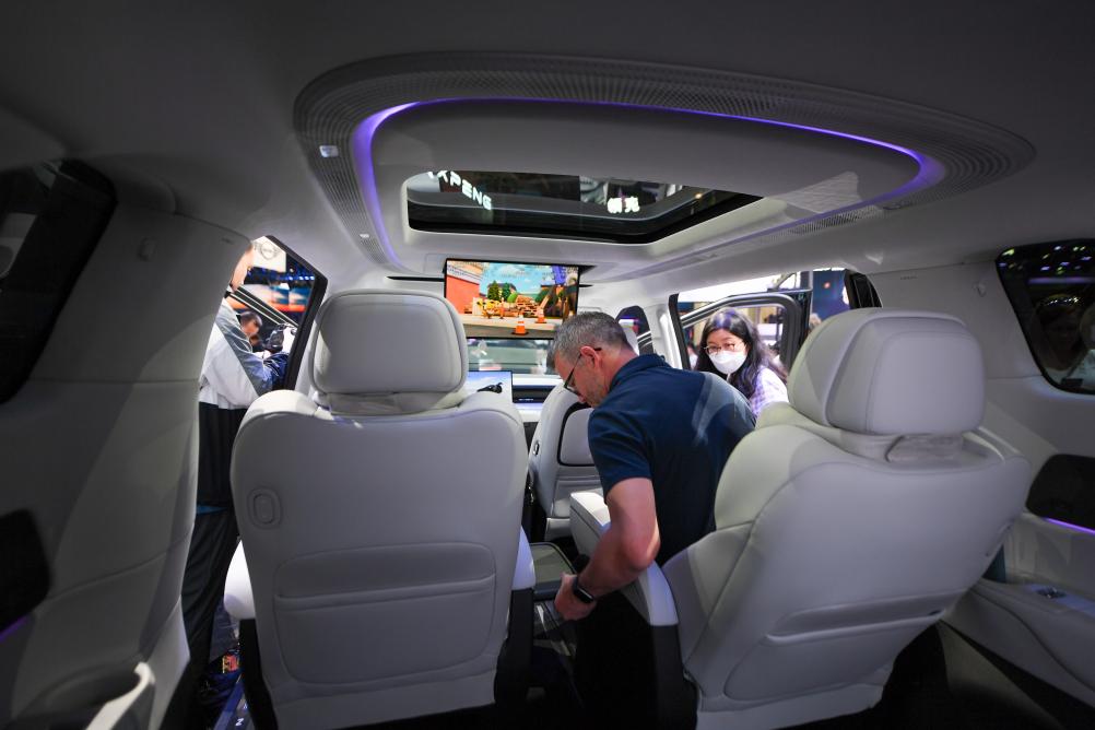 在北京中國(guó)國(guó)際展覽中心順義館舉行的2024北京車展上,參觀者在小鵬汽車展區(qū)體驗(yàn)小鵬X9新能源汽車(2024年4月25日攝)。新華社記者鞠煥宗攝