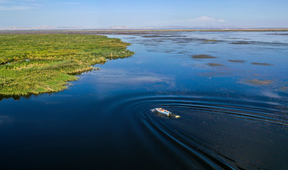 在內(nèi)蒙古烏梁素海湖面上,河湖濕地水環(huán)境保護與修復技術研究團隊成員乘坐快艇去采集湖水樣本(2023年9月15日攝,無人機照片)。