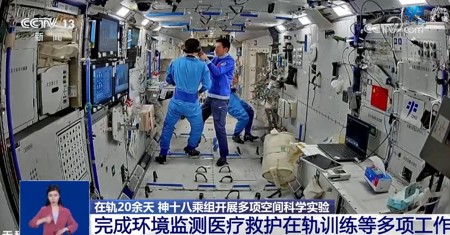 在按計劃開展科學實(試)驗及實驗裝置維護的同時,三名航天員還完成了空間站內環(huán)境監(jiān)測、醫(yī)療救護在軌訓練等多項工作。
