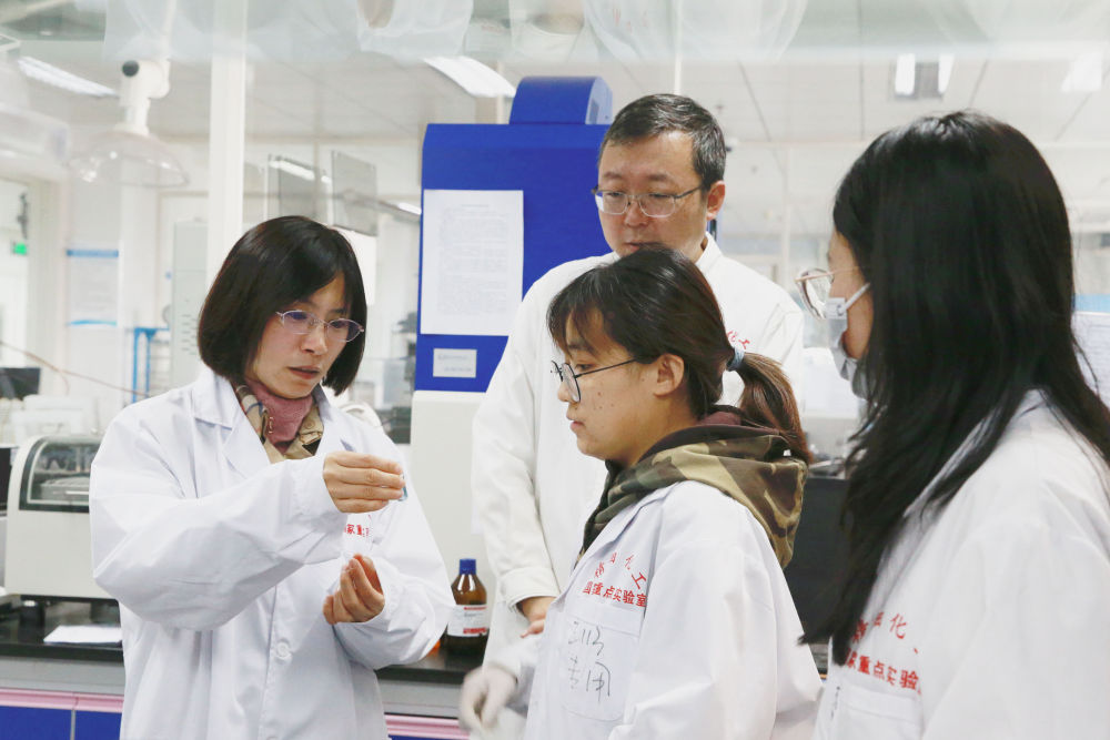 大連理工大學化工學院樊江莉(左)教授與同事及學生查看實驗結果(2021年11月攝)。新華社發(fā)