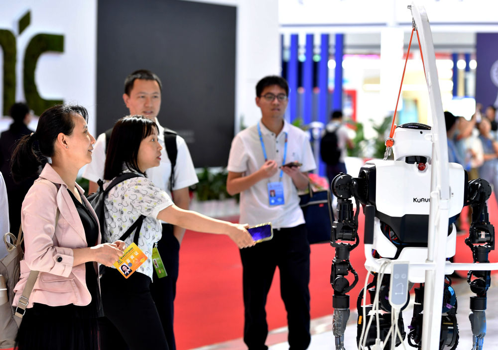 5月24日,在第七屆數(shù)字中國建設(shè)峰會現(xiàn)場體驗區(qū),觀眾在觀看“移動愛家機器人”。新華社記者魏培全攝