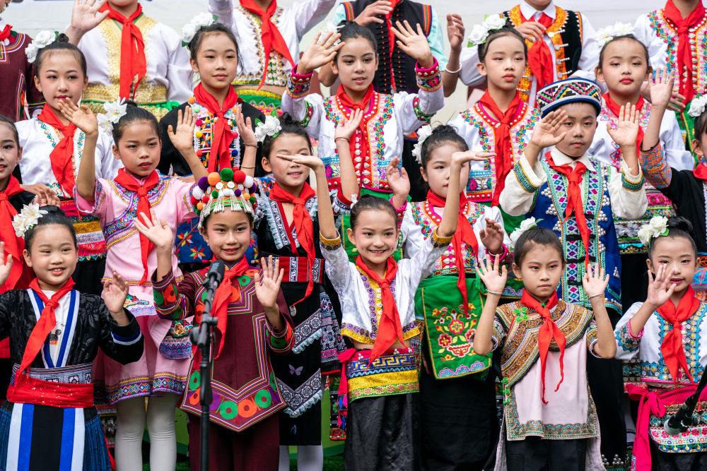 “咿唔瑟,咿唔瑟,吸噶拉羅,哈賽賽,賽哩羅作搓……”(歌詞大意為:巧遇大家來(lái)唱歌喲)視頻連線(xiàn)的另一邊,隨著哈尼族兒歌《阿密策》響起,38名身著苗、瑤、傣、哈尼族等民族服飾的同學(xué)們,將歡快的歌聲獻(xiàn)給“奧比昂爺爺”。