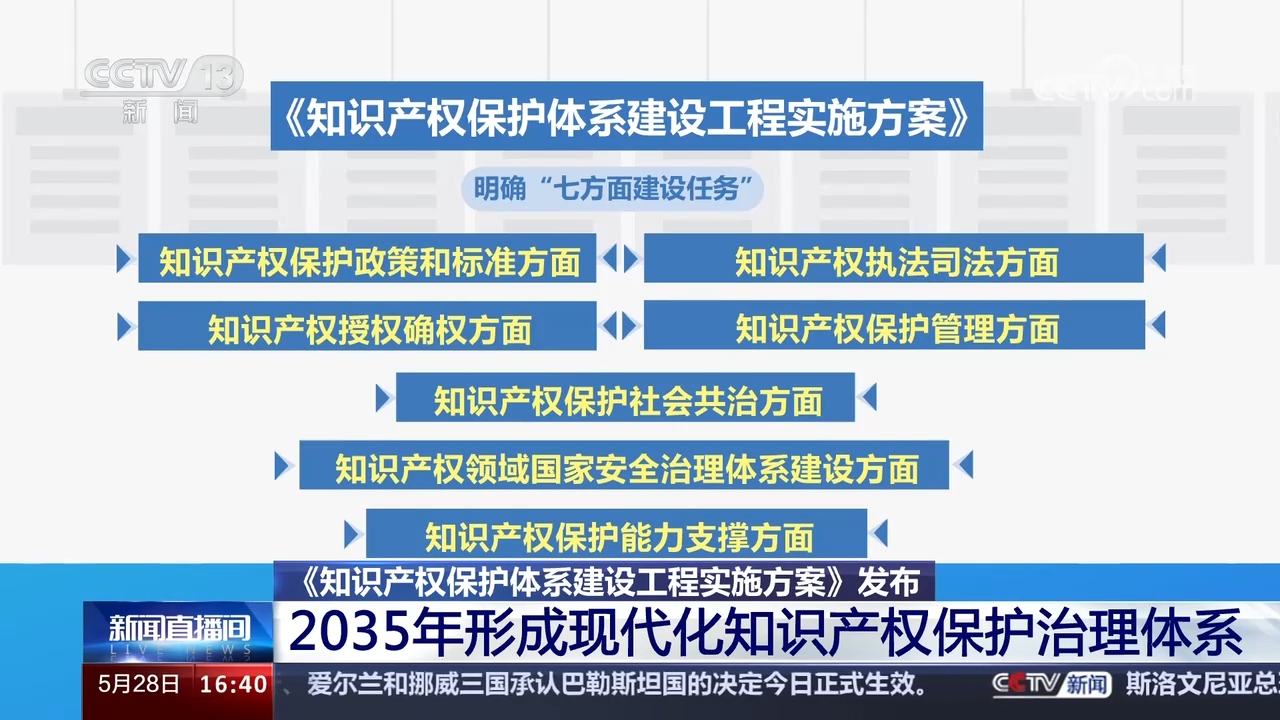 國家知識產(chǎn)權(quán)局5月28日舉行新聞發(fā)布會,重點(diǎn)介紹《知識產(chǎn)權(quán)保護(hù)體系建設(shè)工程實(shí)施方案》(以下簡稱《方案》)有關(guān)情況。《方案》明確,到2035年,知識產(chǎn)權(quán)保護(hù)體系和保護(hù)能力現(xiàn)代化基本實(shí)現(xiàn),形成政府履職盡責(zé)、執(zhí)法部門嚴(yán)格監(jiān)管、司法機(jī)關(guān)公正司法、經(jīng)營主體規(guī)范管理、行業(yè)組織自律自治、社會公眾誠信守法的現(xiàn)代化知識產(chǎn)權(quán)保護(hù)治理體系。