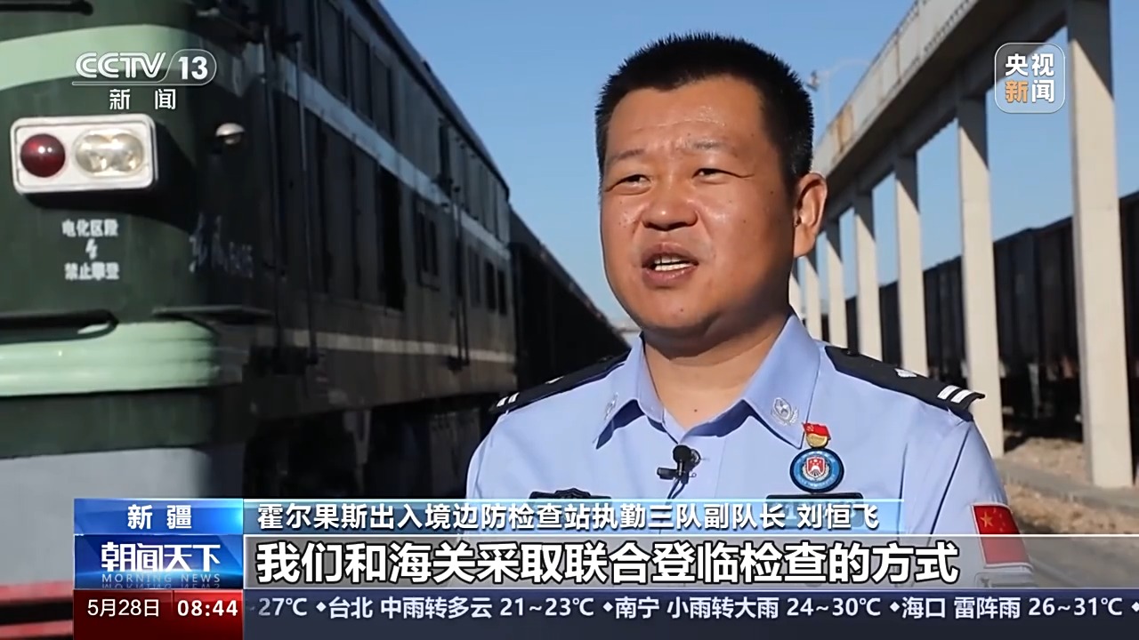 霍爾果斯出入境邊防檢查站執(zhí)勤三隊(duì)副隊(duì)長(zhǎng) 劉恒飛:我們和海關(guān)采取聯(lián)合登臨檢查的方式對(duì)班列車(chē)體進(jìn)行檢查,查驗(yàn)出入境司乘人員和貨物基本是同步進(jìn)行,30分鐘內(nèi)即可完成查驗(yàn)。