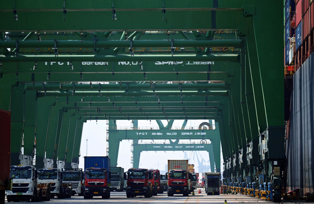 5月29日,卡車在天津港太平洋國際集裝箱碼頭運輸集裝箱。新華社發(fā)