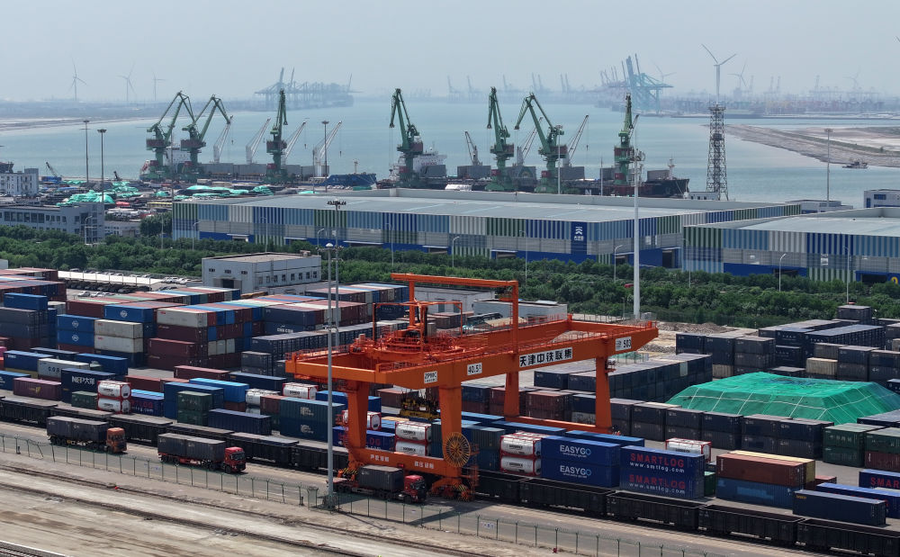5月29日,在中鐵天津集裝箱中心站,龍門吊在進行裝車作業(yè)(無人機照片)。新華社發(fā)