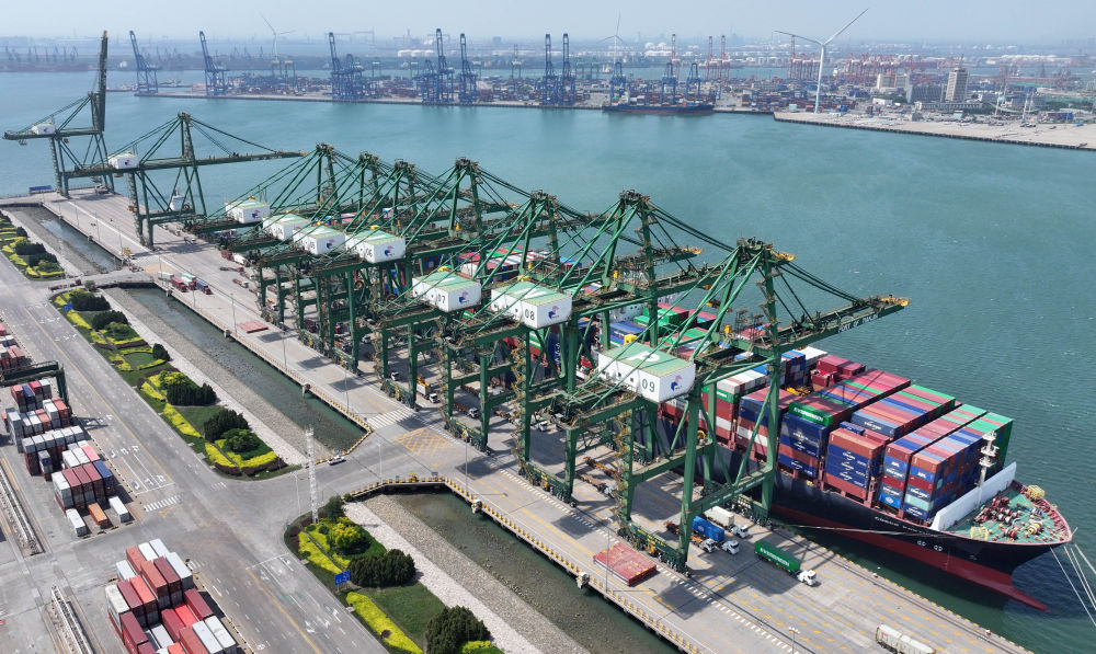 貨輪靠泊在天津港太平洋國際集裝箱碼頭裝載貨物(無人機(jī)照片,5月29日攝)。新華社記者 趙子碩 攝
