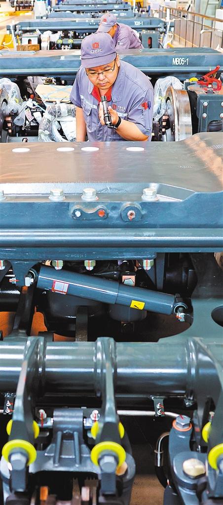 ?5月28日,中車長(zhǎng)客轉(zhuǎn)向架事業(yè)部總成產(chǎn)線組,一臺(tái)臺(tái)轉(zhuǎn)向架排列在數(shù)字化智能產(chǎn)線上。