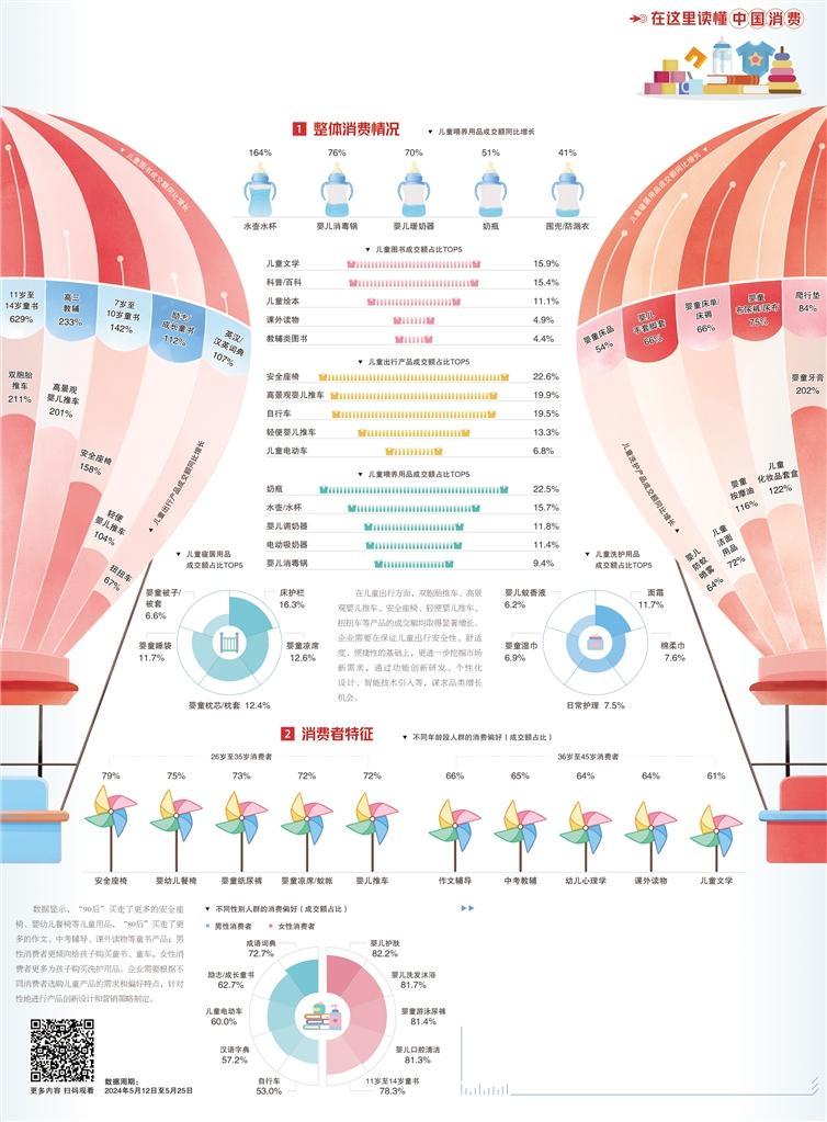 消費(fèi)者精致育兒需求不斷升級(jí),圍繞功能需求細(xì)分、場(chǎng)景消費(fèi)精細(xì)化等維度的兒童用品受到越來越多關(guān)注。在兒童喂養(yǎng)用品消費(fèi)中,水壺水杯、嬰兒消毒鍋、嬰兒暖奶器、奶瓶等成交額同比增長超五成;在兒童洗護(hù)用品消費(fèi)中,嬰童牙膏、嬰童按摩油等產(chǎn)品成交額同比增長超100%。