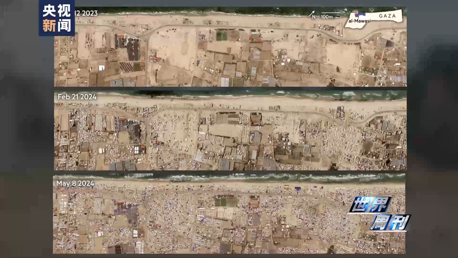 最新的衛(wèi)星圖像顯示,這些人道主義區(qū)域布滿了帳篷和塑料布搭建的臨時建筑,甚至一路延伸到沙灘上,最近的一排距離大海只有幾步之遙。