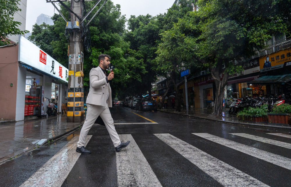 5月28日,王立軒手持相機(jī)在成都街頭邊走邊拍。新華社記者 薛晨 攝