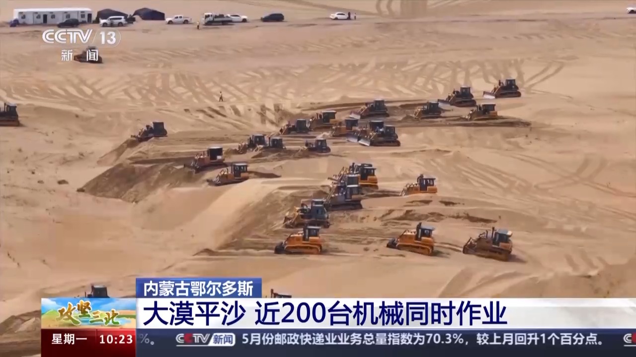 此刻,在我身后,近200臺推土機正在這片沙漠上來回穿行,他們要把這些高低起伏、連綿不斷的沙丘推平整了,再安裝光伏板。這么多推土機具體是如何作業(yè)的?技術(shù)人員告訴我們,因為地形的原因,今天現(xiàn)場的推平作業(yè)大致分為兩個梯隊:第一梯隊負(fù)責(zé)在沙丘的最上面,把頂部的沙子推下來;第二梯隊隨后,填平沙坑,平整現(xiàn)場。