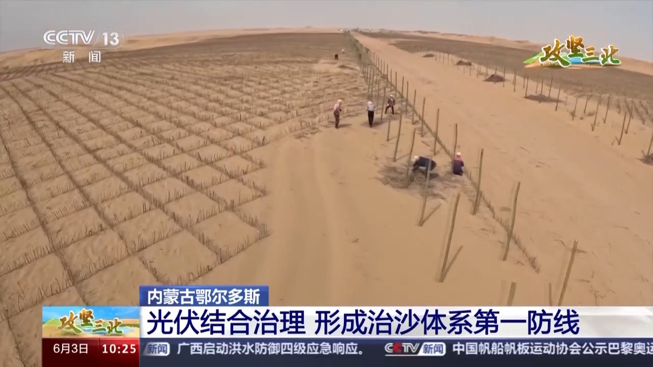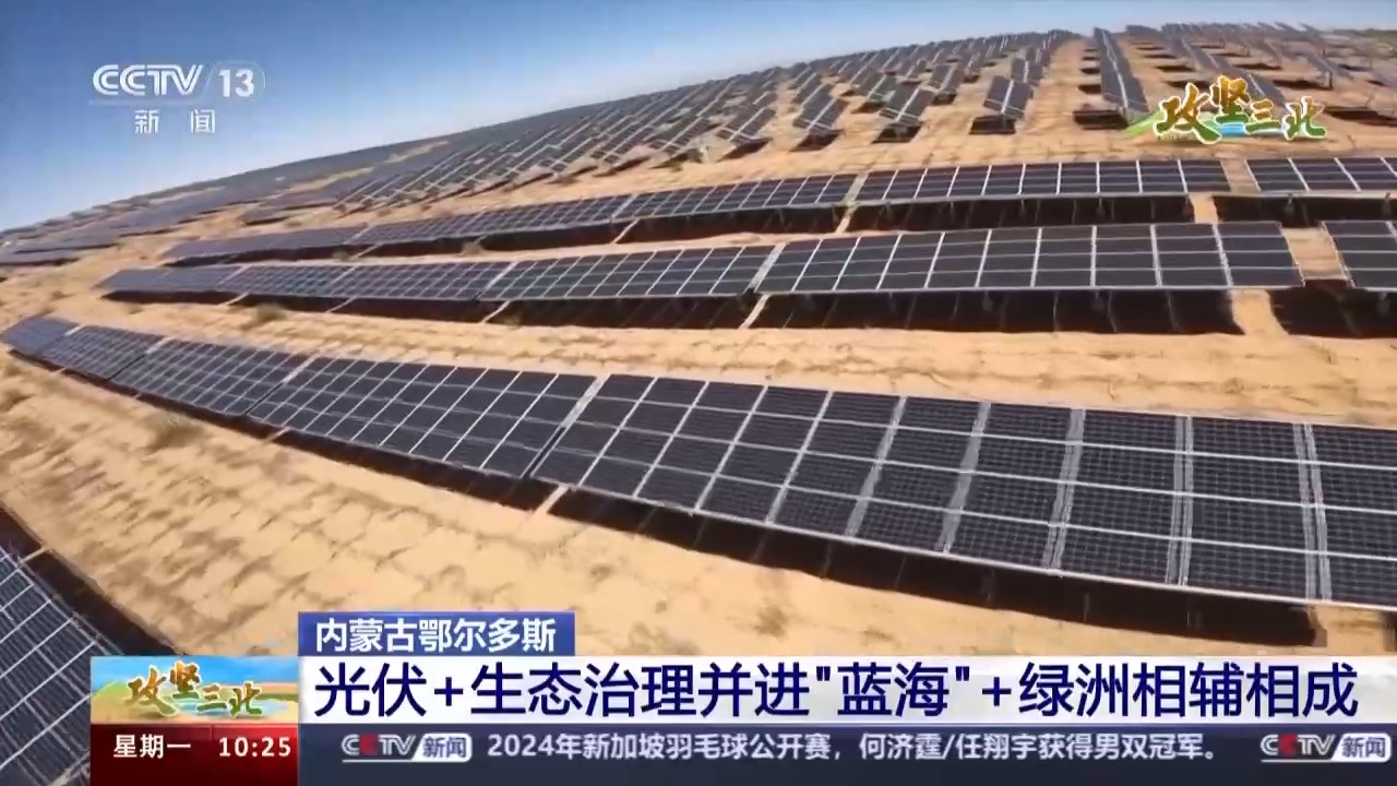 總臺記者 李欣蔓:此時此刻,我就在庫布其沙漠的西側(cè)腹地。拿我現(xiàn)在所在的杭錦旗朔方新能源大基地來說,這里正在探索建設(shè)的就是當(dāng)下最新的光伏治沙模式。說到光伏發(fā)電,我們已經(jīng)很熟悉了,那光伏治沙怎么治?今天我們就在現(xiàn)場找一下答案。