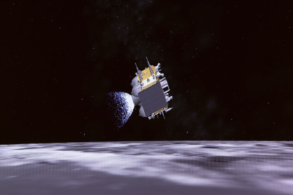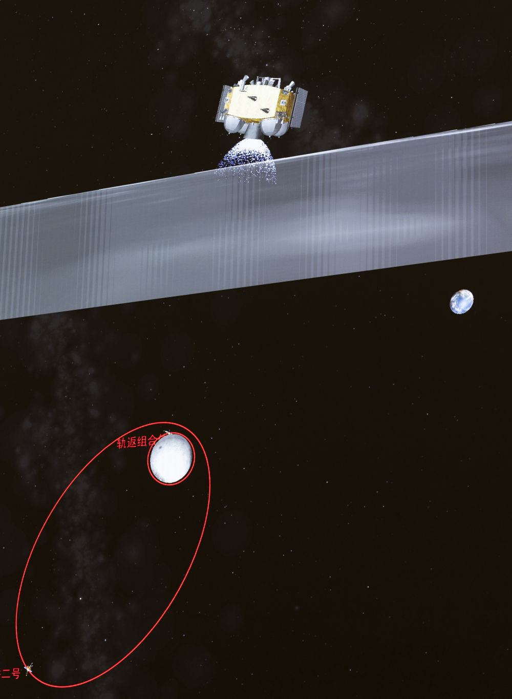 6月4日在北京航天飛行控制中心屏幕上拍攝的等待點火起飛的嫦娥六號著陸器和上升器(動畫模擬畫面)。畫面中,五星紅旗在月球背面展開。