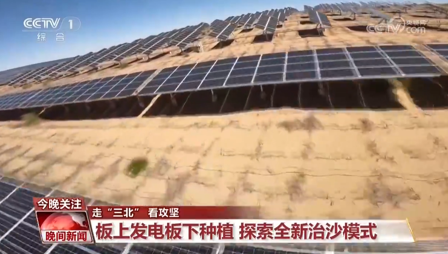 總臺記者 李欣蔓:治沙的腳步不但沒有停,還在不斷探索新的治沙模式。現(xiàn)在我們看到的是鄂爾多斯一個已經(jīng)建好、并網(wǎng)發(fā)電的光伏項目,板上發(fā)電,板下種植,一個空間全方位利用。三重防線,構(gòu)建起了全新的生態(tài)治沙模式。有一個數(shù)據(jù)值得我們關(guān)注,這里的光伏項目占地39萬畝,與此同時,生態(tài)治理面積也將規(guī)劃完成39萬畝。在國家推進光伏治沙項目開發(fā)建設(shè)的進程中,我們看到越來越多的企業(yè)參與其中,在發(fā)展新能源產(chǎn)業(yè)的同時共同擔(dān)負(fù)起治沙的責(zé)任,為一片藍海,一片綠洲的建設(shè),貢獻更多的力量。